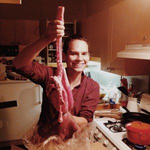 But luckily we weren’t alone in this mess. (I can say with certainty that neither of us would be crazy enough to get into this on our own). Luckily, we also had Fred, our Master Chef. As I think I’ve mentioned before, Fred is French. And thus he believes that he can cook anything. (This is a safe belief, however, since nothing he has ever made has been anything short of Michelin-star calibre.) And, while I’ve mentioned that the origin of the homemade haggis idea is a bit fuzzy, I am 99.9% sure that Fred is the one who provided it with its first breath of life. Possibly to counter a retort by Alasdair (our half-Scottish friend) who suggested that haggis is impossible to make from scratch and not even the bravest Scot would attempt to do so, or possibly because Fred was in Glasgow over the summer and tried some there, or possibly because the news was aflutter with the independence movement last month. Whatever the reason, it mattered very little as I stared into our box of fresh, bloody, sheep guts, feeling like I was in one of my undergrad vertebrate physiology labs all over again.