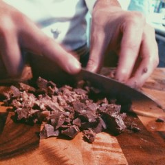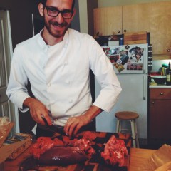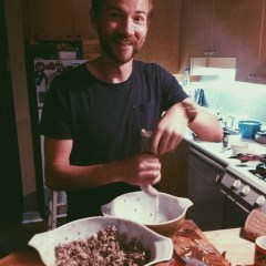 Once the organs had boiled for a few hours, Fred started the second part of preparation: chopping. He finely diced all of the meat, and mixed in the appropriate spices, onions, and oatmeal*. And here it got a little tricky. Since we didn’t have the stomach, the next step involved stuffing the intestine. On the advice of our butcher, we modified a plastic bottle into a funnel and used this to generate enough concentrated force to push the organ mix into the casing. Naturally this process was very time consuming, but after about an hour, Fred started the first batch of haggis sausages. Boiled in the broth from the first step, the sausages were put on the stove for another 90(ish) minutes to cook. It was at some point during this stage that Alasdair arrived, and it wasn’t long before he, too, was armpit deep in haggis. Meanwhile, Wilf set to preparing the iconic haggis side dish: neeps and tatties, and I took Cousteau for a stroll. (This ‘stroll’ was actually an attempt at running away, but Cousteau couldn’t bring himself to be parted from the scent of boiling meat for long and forced me to return.)